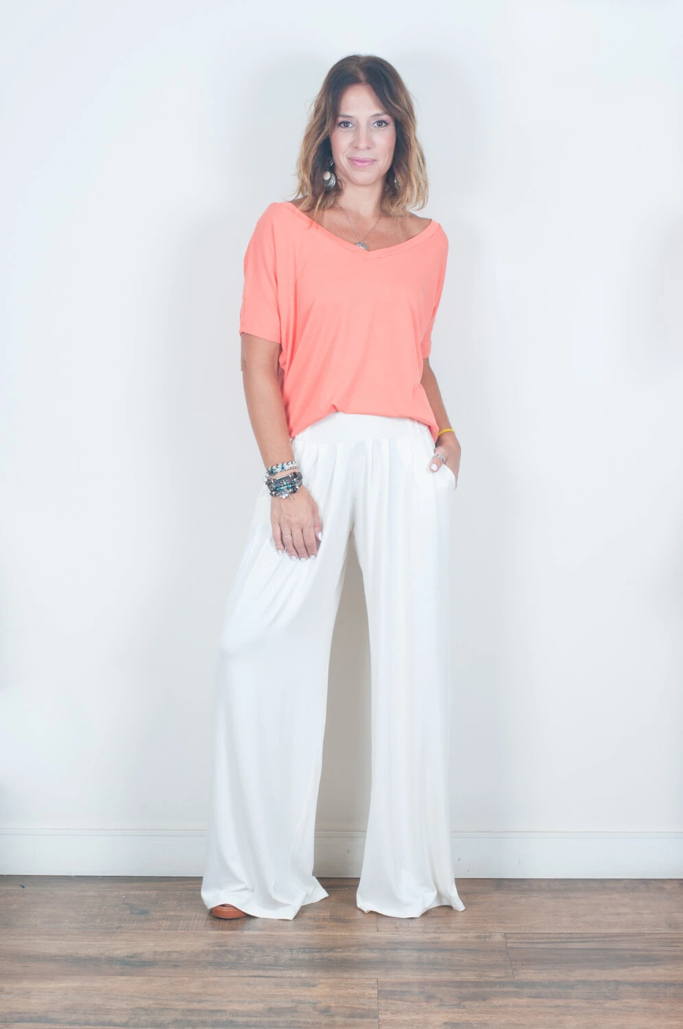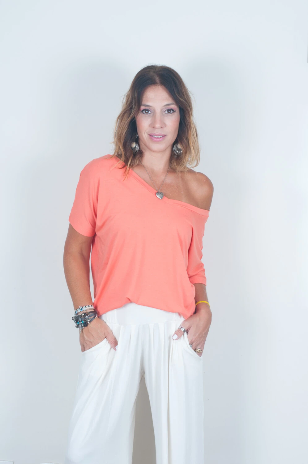 Blusa manga curta decote V frente e costas que pode ser usada de mais de uma maneira como por exemplo, ombro caído.