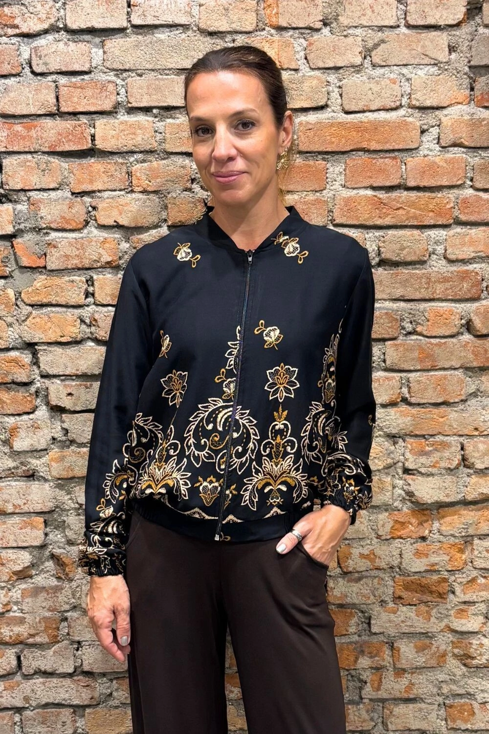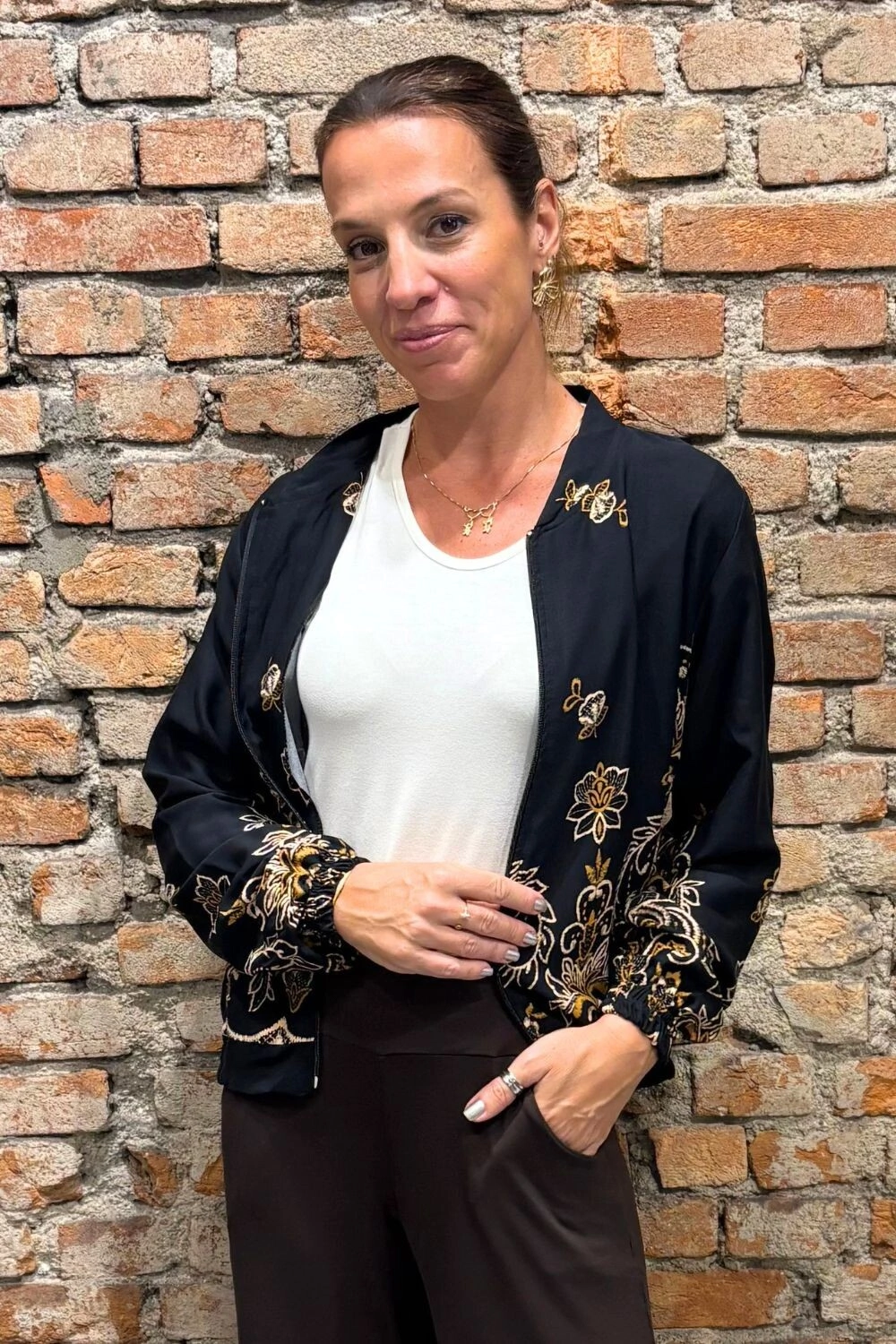 Tem caimento leve, manga longa, bolsos frontais com zíper. Não tem forro.