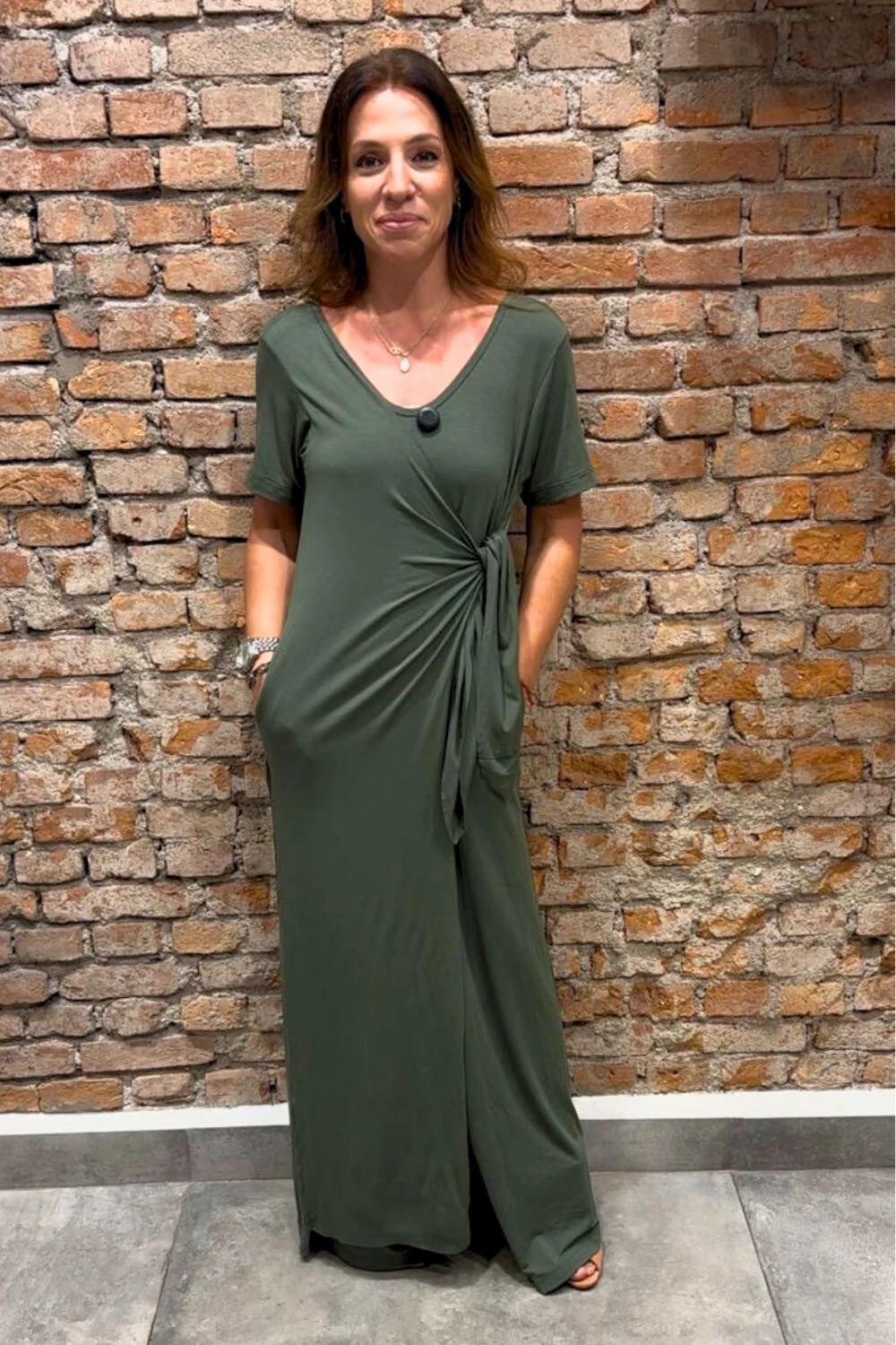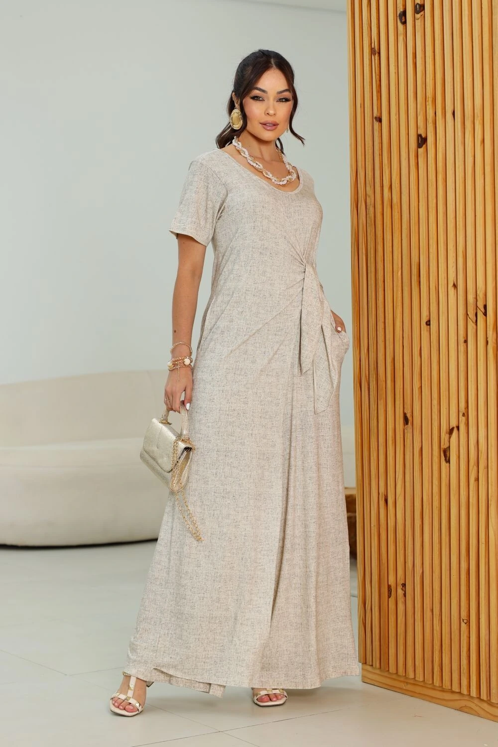 Macacão longo estilo pantalona, com manga curta, transpassado na frente para amarração lateral! Super MODERNO!